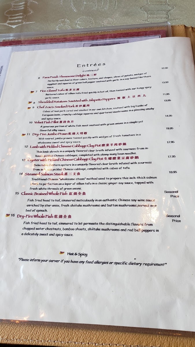 Dalian Restaurant shines with its diverse menu that features beautifully crafted dishes. Among the highlights are the Chicken Strips on a Sizzling Plate (铁板鸡柳), where tender chicken breast is marinated and sautéed with juliennes of vibrant vegetables, all served in a light peppery garlic sauce that dances on your palate. At just $20.95, this dish not only delivers on flavor but also offers a sizzling presentation that is sure to impress.